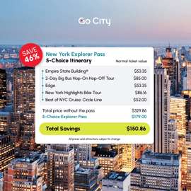 Explore a cidade de Nova York com o Go City Explorer Pass e economize até 50%* na entrada em 2 a 10 atrações, passeios e experiências incríveis! Com mais de 90 opções imperdíveis à sua escolha, você poderá visitar ícones como o Empire State Building e o 9/11 Museum, entre muitos outros. Monte seu roteiro personalizado e aproveite ao máximo sua viagem!